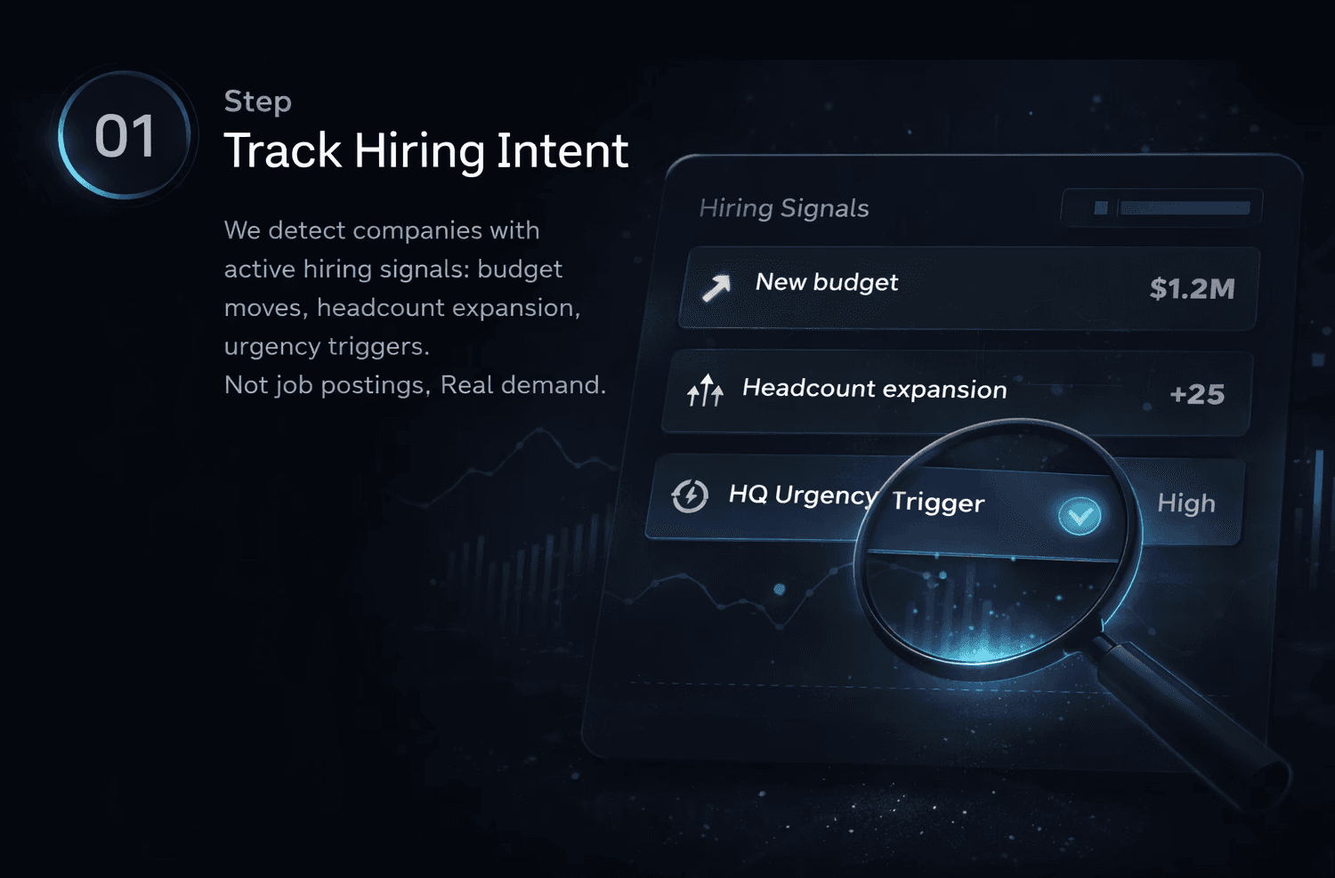 We detect companies with active hiring signals: budget moves, headcount expansion, urgency triggers. Not job postings. Real demand.